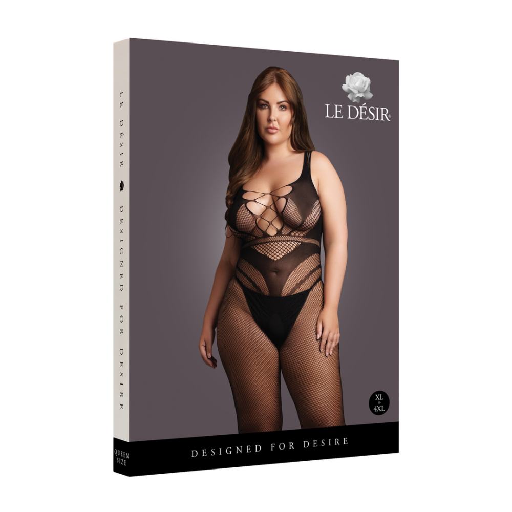Combo visnet bodystocking met open kruis en verleidelijke lijnen die je rondingen accentueren. De zachte super stretchy stof past in de maten XL tot 4XL.