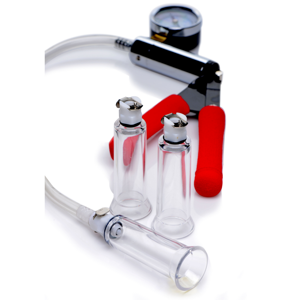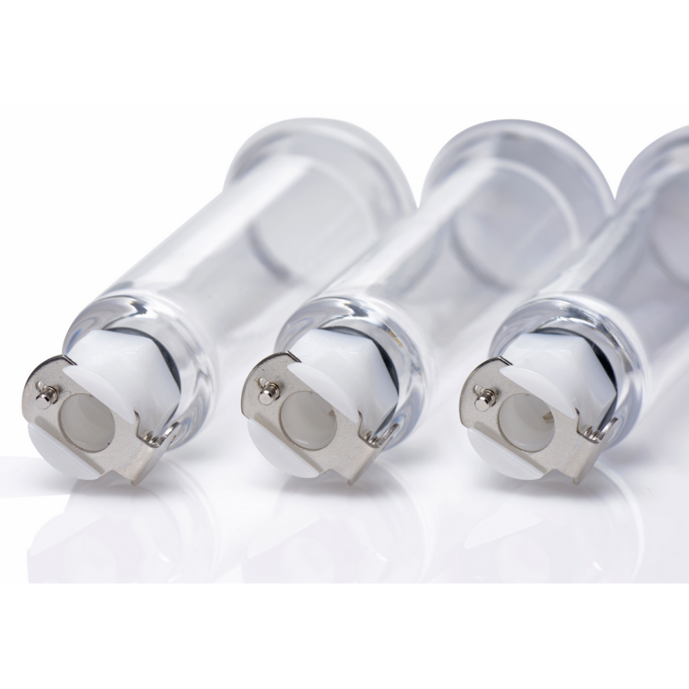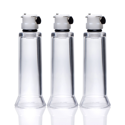 Suction provides exquisite sensation and enhanced sensitivity! Three small cylinders connect to a compatible pumping device to pinpoint pleasure on nipples, the clitoris, and other small areas. Create a strong seal, with the aid of a lubricant if necessary, and experience the tight pulling sensation as your delicate flesh is drawn into the cylinder and blood flow increases. The convenient clasps allow each accessory to be disconnected from your pump while still retaining the pressure within, allowing the use of all three cylinders at once. Release your tender parts for access to more hands-on play by pressing the small silver button on the top of each clasp. These small, durable pumping accessories are a stimulating way to amplify your solo or partner play! Measurements: 3.8 inches in total length, 2.9 inches insertable. 1.1 inches in diameter at opening, .85 inches in diameter throughout length of cylinder. Material: Plastic. Color: Clear. Note: Pump not included.